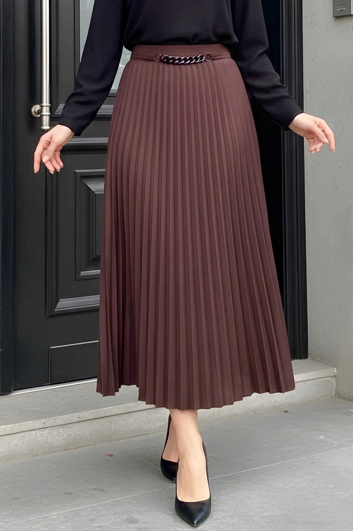 * Ürün Detay :Etek, hem rengi hem de formuyla oldukça sofistike ve modern bir duruş sergiliyor.Eteğin muntazam pliseli yapısı, hareket halindeyken harika bir akıcılık sağlar. Plise etekler her zaman "çabasız şıklık" için en iyi tercihlerden biridir.Bel kısmındaki aynı renkten kemer ve üzerindeki siyah zincir detayı, eteğe modern bir dokunuş katmış. Bu detay, bel bölgesini vurgulayarak daha zarif bir silüet oluşturuyor.Ürünümüz astarlıdır.
