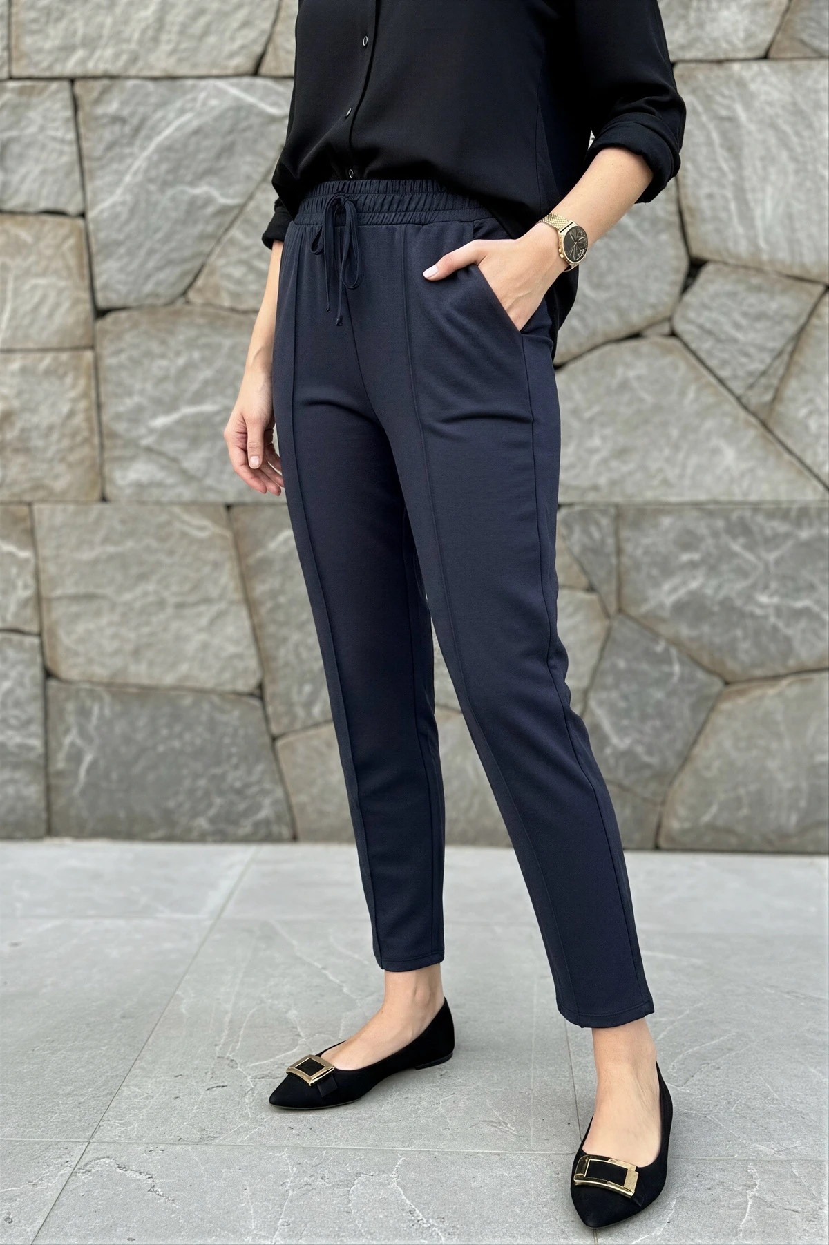 Siyah Bel Lastikli Çimalı Modal Pantolon
