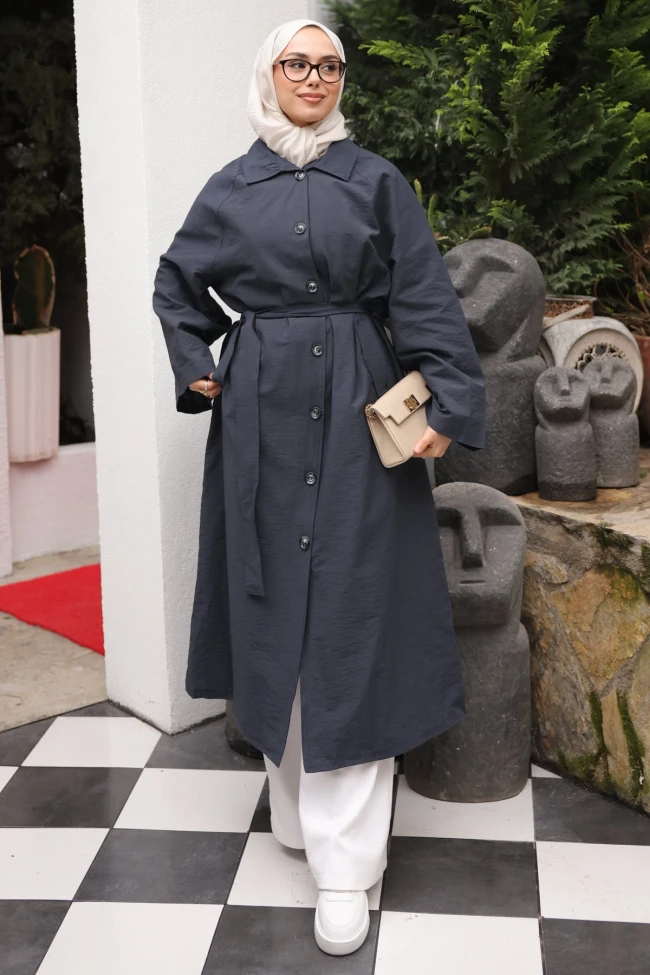 * Ürün Detay : Hem rengi hem de dokusuyla yeni nesil tesettür modasına çok uygun ve oldukça kullanışlı bir parça.Kumaşın krinkıl dokusu, ürüne spor-şık bir hava katmış.Reglan kol kesimi ve beldeki kuşak, ürüne modern bir siluet kazandırıyor. Dik yakadaki düğme detayı, rüzgarlı havalar için fonksiyonel olduğu kadar estetik bir duruş da sergiliyor.Ürünümüz bel kuşaklıdır ve ceplidir.