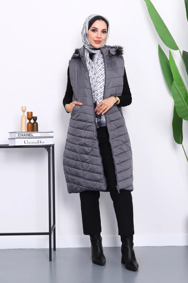 Siyah Kapüşonlu Uzun Şişme Yelek Kahverengi Kapüşonlu Uzun Şişme Yelek Bej Kapüşonlu Uzun Şişme Yelek
