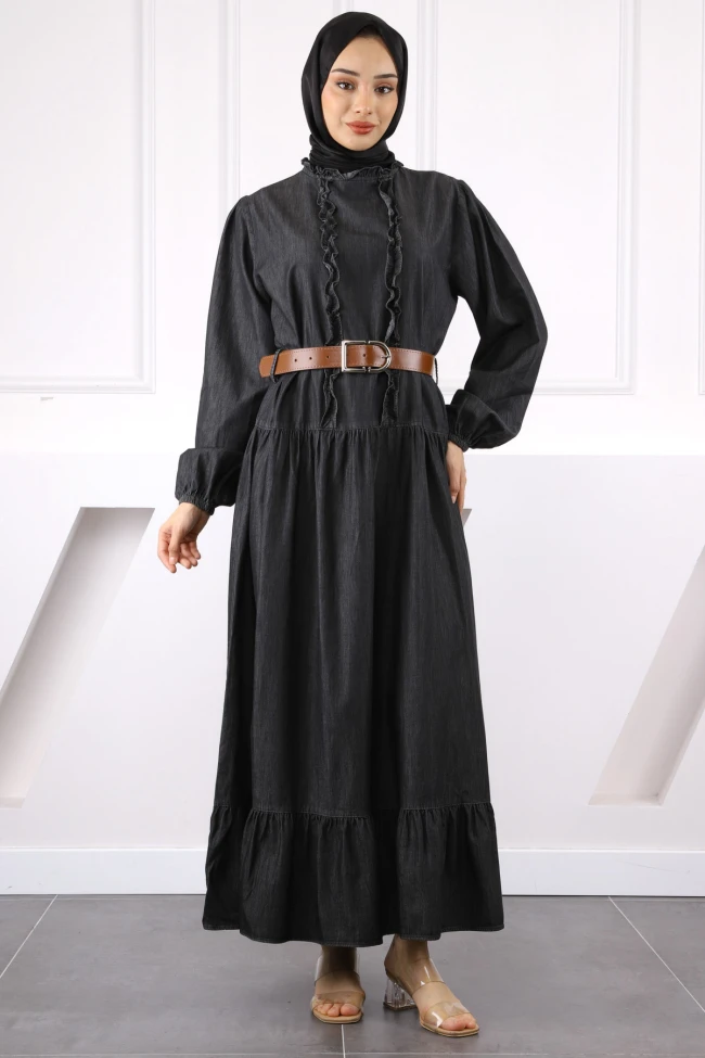 Mavi Kol Lastikli Eteği Katlı Kemerli Elbise