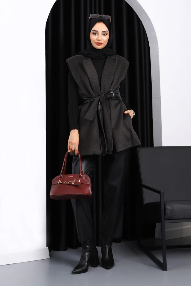 Siyah Kuşaklı Çift Cepli Kaşe Yelek Taş Kuşaklı Çift Cepli Kaşe Yelek
