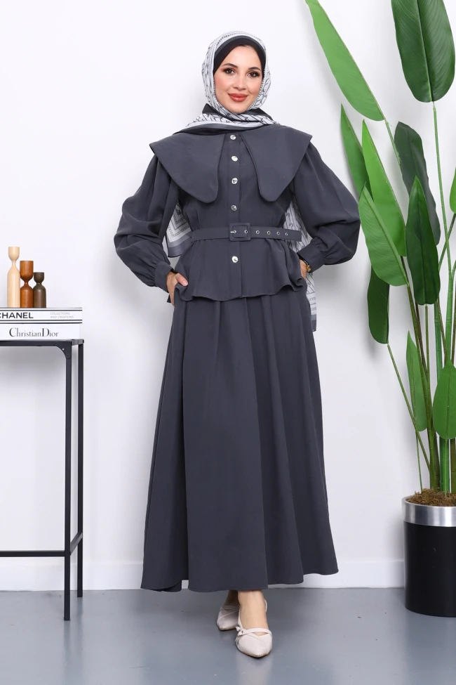 * Ürün Detay : Ürünümüz Modal Kumaştan Üretilmiştir. Gömlek ile Etek ikili takım şeklindedir. Gömlek ön kısmı düğmeli olup, bel kısmı kemer aksesuarlıdır. Etek yan kısımları ceplidir.