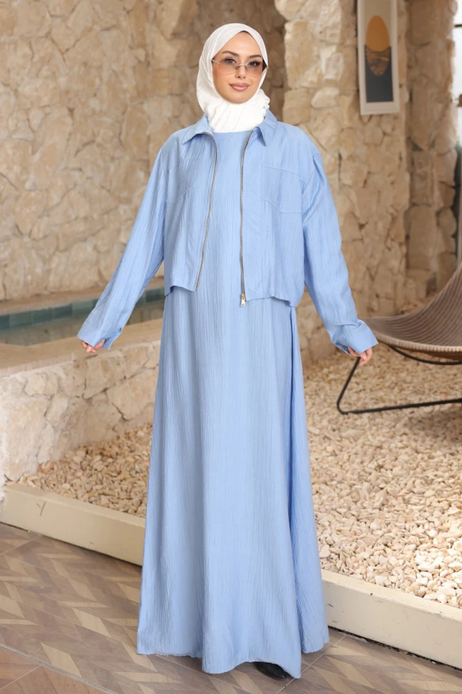 * Ürün Detay : Ceket elbise takımı, modest giyim tarzı için oldukça ferah ve şık bir seçenek sunuyor.Elbisenin düz ve geniş kesimi , ceketin ise crop formda olması vücut hatlarını belli etmeyen zarif bir silüet oluşturmuş.Ceketteki fermuar ve geniş yaka detayı, klasik bir takımı daha modern ve şık bir dış giyim parçasına dönüştürmüş.Ceket ve elbise olarak 2 li takım.