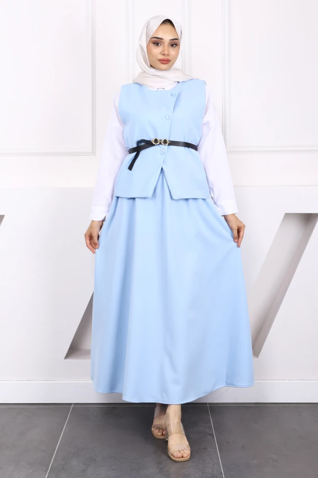 * Ürün Detay : Ürünümüz Dabıl Krep kumaştan üretilmiştir. Yelek ile Etek ikili takım şeklindedir. Yelek ön kısmı düğme detaylı olup, bel kısmı kemerlidir. Etek bel kısmı fermuarlıdır.