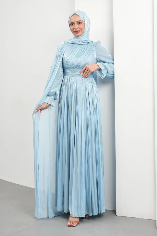 * Ürün Detay :Abiye modelimiz modest bir çizgide oldukça zarif bir görünüm sunuyor.Elbisenin tamamında kullanılan dikey plise detayları, boyu olduğundan daha uzun göstermek için harika bir illüzyon sağlıyor. Beldeki kalın kuşak detayı, vücut hatlarını zarifçe belirginleştirerek proporsiyonu dengeliyor.Omuzdan aşağıya doğru süzülen şifon pelerin detayı, elbiseye hareket ederken uçuş uçuş bir görünüm sağlayarak asalet katıyor.