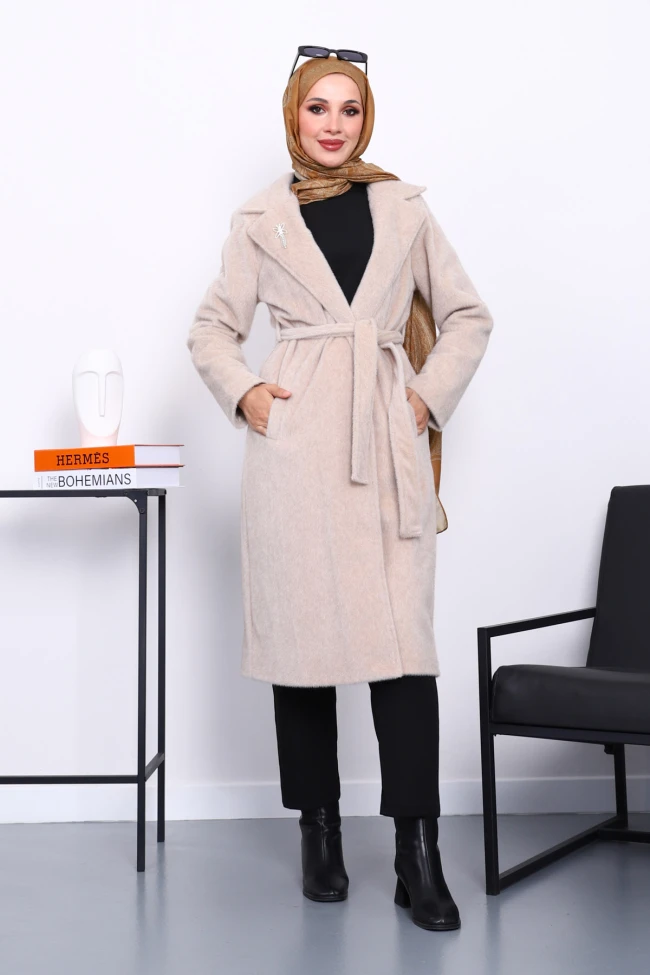 * Ürün Detay : Ürünümüz yeni sezona uygun Angora kumaştan üretilmiştir.  Bel kısmı kuşaklı olup, yan kısımları ceplidir. Yaka kısmı broş detaylıdır.