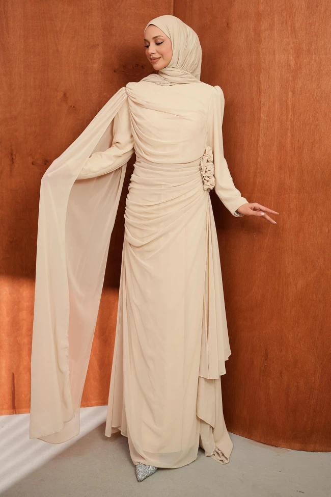 * Ürün Detay : Abiye, hem asil duruşu hem de modern tasarım detaylarıyla dikkat çeken oldukça şık bir parça.Gövdeden eteğe doğru inen asimetrik drapeler, elbiseye hareket kazandırırken aynı zamanda vücut hatlarını yumuşatarak zarif bir silüet oluşturmuş. Bel bölgesindeki çiçek detayı ise odak noktasını merkezde toplayarak estetik bir dokunuş katıyor.Omuzdan dökülen kumaş detayı, elbiseye "pelerin" havası katarak modern bir hava vermiş.