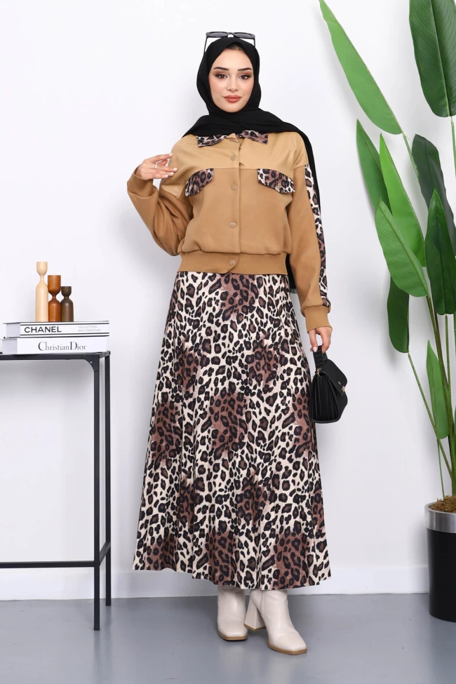 Siyah Leopar Desenli Ceket Etekli Takım Kahverengi Leopar Desenli Ceket Etekli Takım