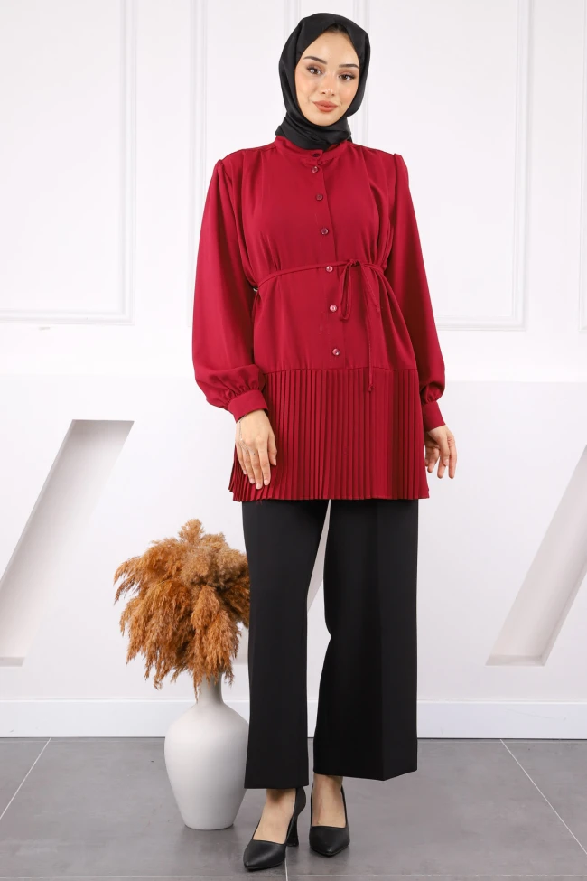 * Ürün Detay : Ürünümüz Krep kumaştan üretilmiştir. Ön kısmı düğme detaylı olup, bel kısmı kuşaklıdır. Etek uç kısmı pilise olarak tasarlanmıştır.
