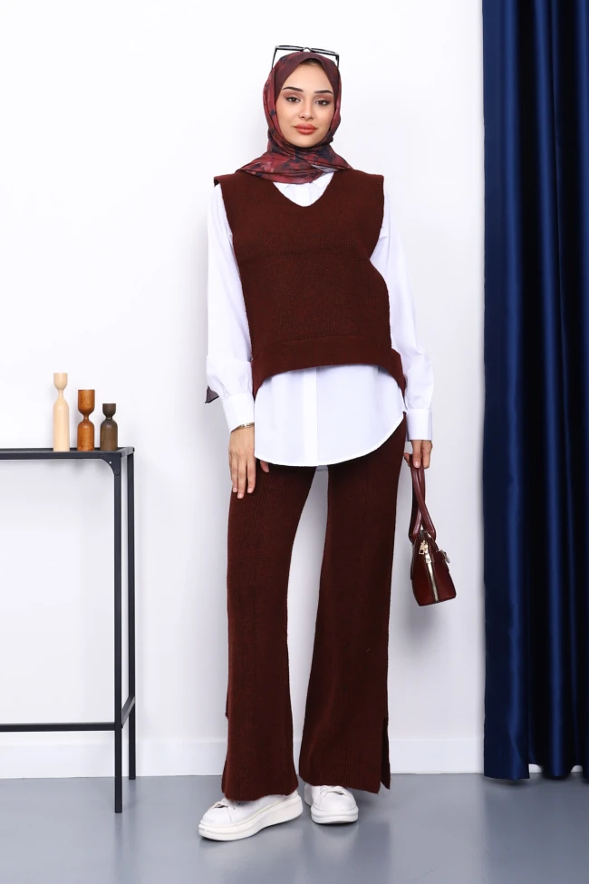 Siyah Gömlekli Üçlü Triko Takım Vizon Gömlekli Üçlü Triko Takım Füme Gömlekli Üçlü Triko Takım Kahverengi Gömlekli Üçlü Triko Takım