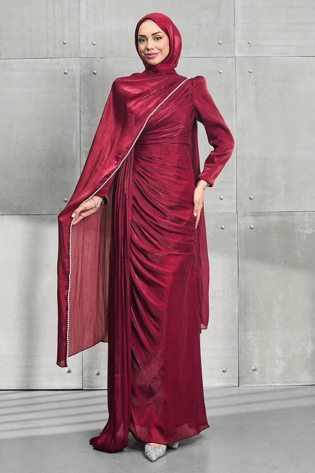 * Ürün Detay : Özel günleriniz için kurtarıcı parça! Kendinden pelerinli tasarımı sayesinde aksesuar zahmetine girmeden tam bir şıklık sunan abiyemiz, dikey pileli etek yapısıyla daha uzun ve ince bir görünüm vadediyor.Modern tesettür şıklığını inci zarafetiyle birleştirin.Bel bölgesindeki çapraz drape detayları, karın bölgesini kusursuz bir şekilde kamufle ederken, eteğin dikey pilleleri boyu olduğundan daha uzun gösteriyor.Omuzlardan dökülen tül pelerin, tasarıma dramatik bir hava katarken, kenarlarındaki inci işlemeler yüz hattını aydınlatan zarif bir çerçeve oluşturuyor.