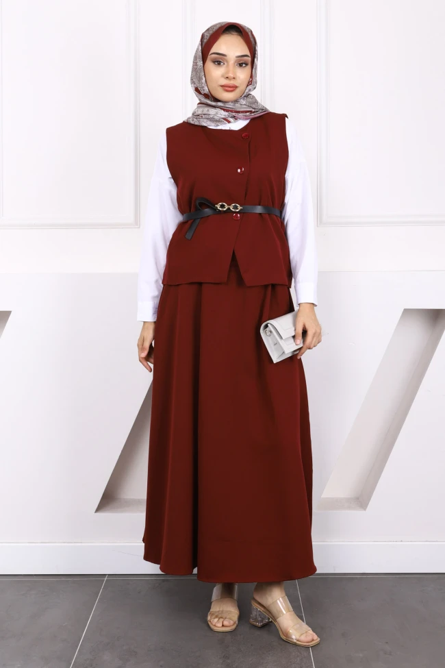 * Ürün Detay : Ürünümüz Dabıl Krep kumaştan üretilmiştir. Yelek ile Etek ikili takım şeklindedir. Yelek ön kısmı düğme detaylı olup, bel kısmı kemerlidir. Etek bel kısmı fermuarlıdır.