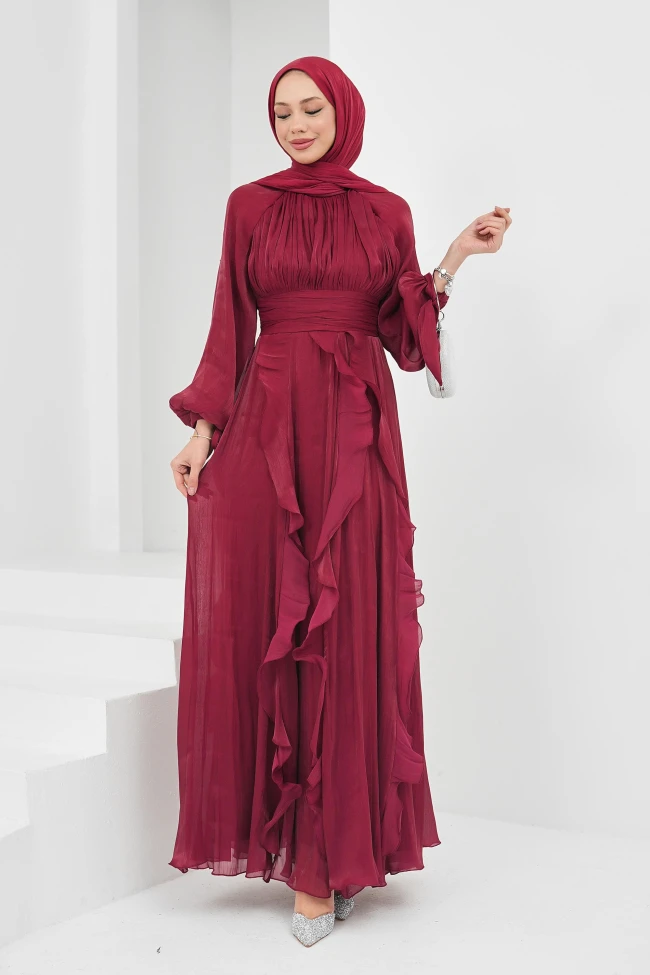 * Ürün Detay : Abiyemiz hem kullanılan kumaş dokusu hem de romantik detaylarıyla koleksiyonun en zarif parçalarından biri olmaya aday.Ürünümüz şifon kumaştan üretilmiştir.Sırt fermuarlıdır.Etek kısmından aşağıya doğru inen dikey fırfır detayları, tasarıma hem hareket hem de romantik bir hava katmış. Bu detaylar aynı zamanda silüeti daha akışkan gösteriyor.Beldeki geniş kumaş kuşağı, piliseli dokuyu toplayarak vücut hattını belirginleştiriyor ve üst beden ile etek arasında şık bir geçiş sağlıyor.Manşetlerdeki bağlama detaylı balon kollar, son dönem tesettür modasının en hit ayrıntılarından biri. Bu kollar, elbiseye hem modern hem de nostaljik bir dokunuş ekliyor.