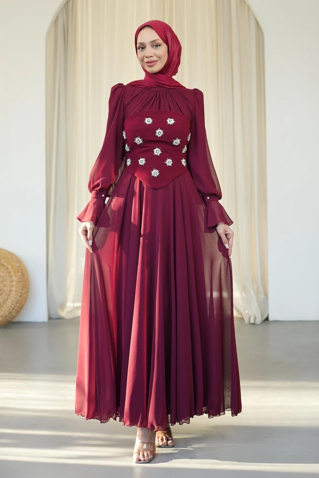 * Ürün Detay :Elbisenin en dikkat çekici kısmı, gövdeyi saran korsaj yapısı. Üzerindeki çiçek formundaki taş işlemeler, abiyenin asaletine ışıltı katarak  "gece kıyafeti" statüsüne taşıyor. Korsajın alt kısmındaki hafif V kesim, beli daha ince ve uzun gösterme etkisine sahip.Şifon kolların bilek kısmındaki volan detayları, tasarıma romantik ve hareketli bir hava katmış. Bu tarz kollar, hareket halindeyken çok zarif bir akışkanlık sağlar.Etek kısmında kullanılan bol dökümlü şifon kumaş, elbiseye hem hafiflik hem de görkemli bir duruş kazandırıyor.