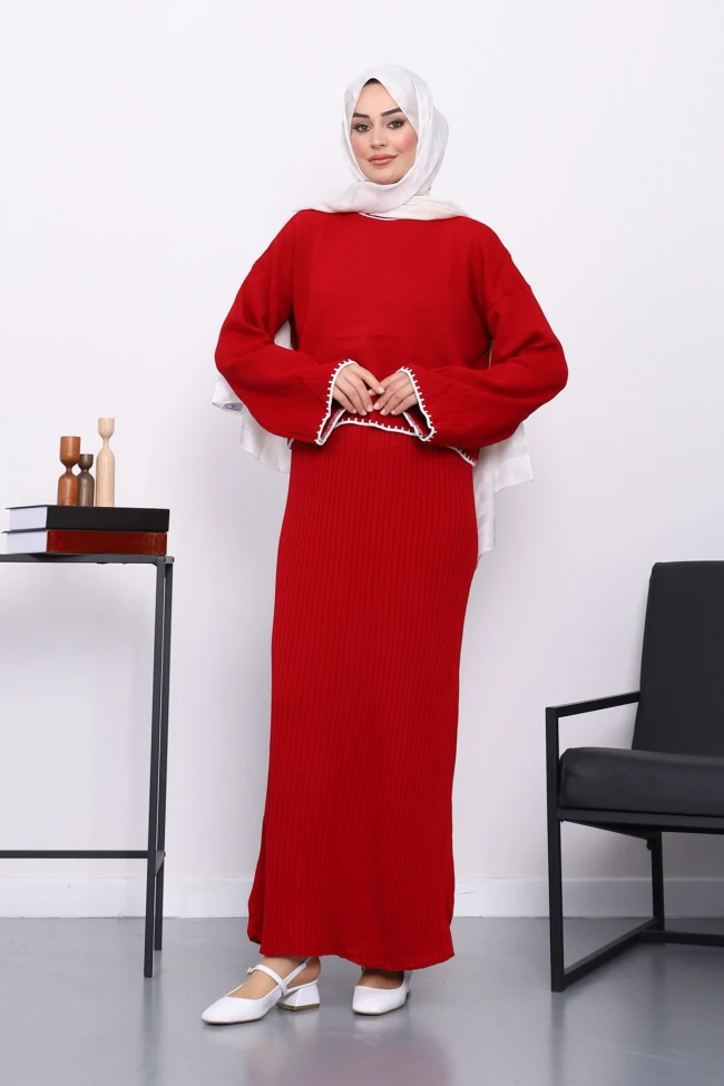 * Ürün Detay : Ürünümüz triko kumaş olarak üretilmiştir. Kazak ile elbise takım şeklindedir.