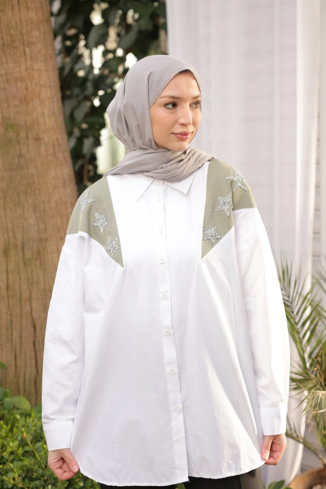* Ürün Detay : Ürünümüz Pamuk Poplin  kumaştan üretilmiştir. Ön kısmı düğme detaylıdır. Omuz kısımlarında pul işleme detayları yer almaktadır.