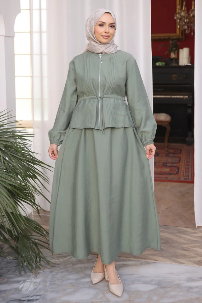 * Ürün Detay : Takımı, modern muhafazakar moda çizgilerini fonksiyonel detaylarla birleştiren şık bir takım.Boydan fermuarlı olması kullanım kolaylığı sağlarken, beldeki büzgü detayı vücut hatlarını belli etmeden form kazandırıyor. Göğüs kısmındaki pileli dokunuşlar ürüne hareket katarak sıradanlıktan uzaklaştırmış.Geniş kesim etek, hem konforlu bir hareket alanı sunuyor hem de tesettür giyim standartlarına tam uyum sağlıyor.Lastikli manşetler, balon kol havası vererek modern bir görünüm sunuyor.