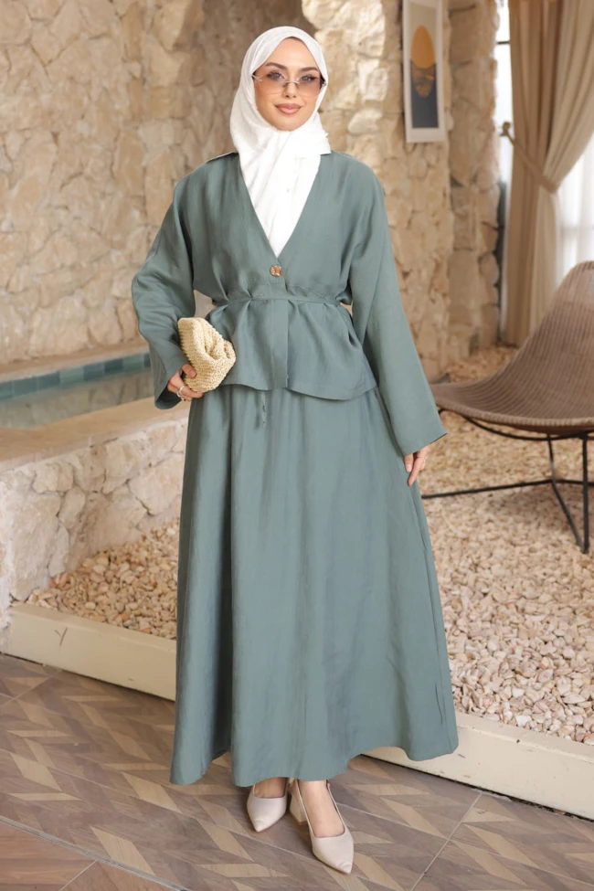 * Ürün Detay : Takım, modern ve zarif bir tesettür kombinasyonu olarak öne çıkıyor.V yakalı ve tek düğmeli ceket tasarımı oldukça minimalist. Bel kısmındaki hafif büzgü detayı, düz kesimli eteğe geçişte vücut hatlarını zarifçe dengeliyor. Geniş kol kesimi ise hem konfor sağlıyor hem de modern bir silüet oluşturuyor.A kesim veya düz inen uzun etek, ceketin hareketli yapısını sade bir şekilde tamamlayarak bütünlük sağlıyor.Etek bel lastiklidir.