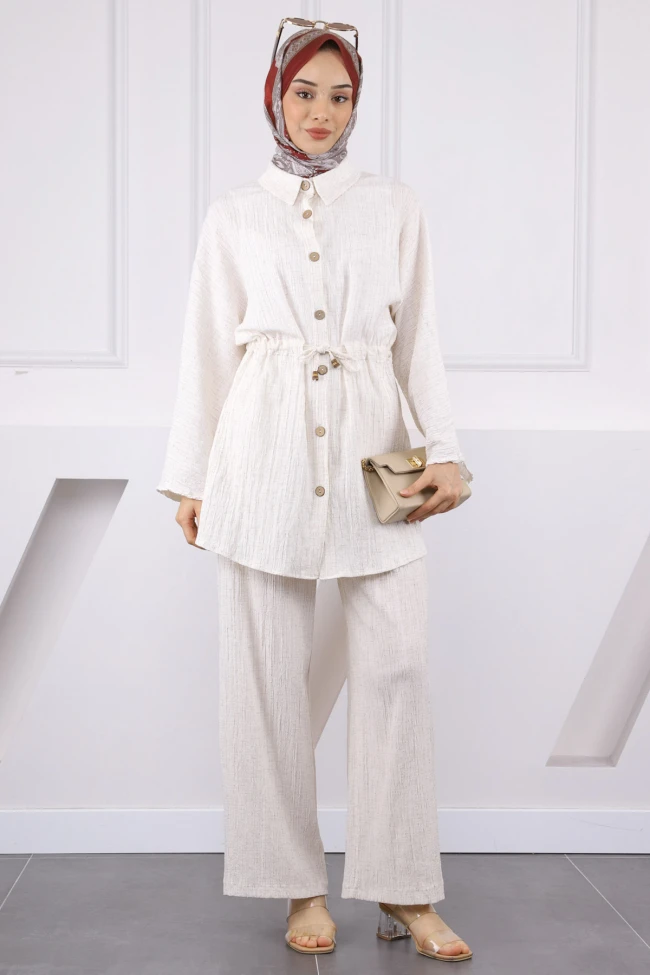 * Ürün Detay : Ürünümüz Dokuma Keten kumaştan üretilmiştir. Tunik ile Pantolon ikili takım şeklindedir. Tunik ön kısmı düğmelidir. Pantolon bel kısmı lastiklidir.