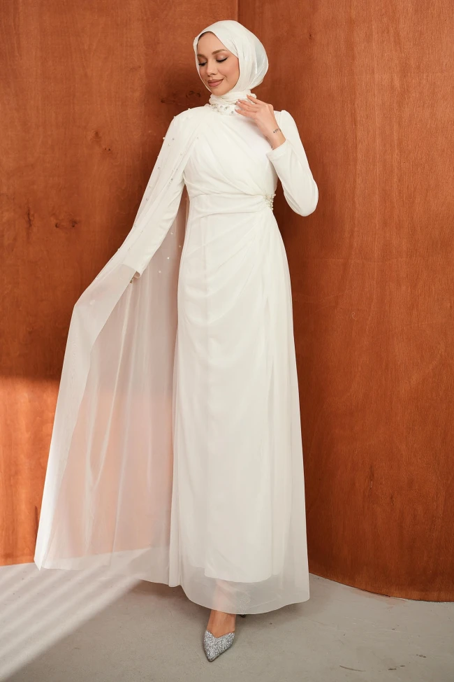 * Ürün Detay : Abiye, özellikle modern ve zarif bir silüet arayanlar için oldukça dikkat çekici bir parça.Bel bölgesinde toplanan asimetrik drapeler, elbiseye hareket katarken aynı zamanda beli daha ince gösteren bir illüzyon yaratıyor.Yakada ve beldeki drapajın başlangıç noktasında kullanılan inci detayları, elbiseye sofistike bir hava katmış. Özellikle omuzdan aşağı dökülen tül pelerindeki inci serpiştirmeleri, tasarıma "peri masalı" estetiği kazandırıyor.Tek omuzdan uzanan tül pelerin, elbiseye dramatik bir duruş katıyor.