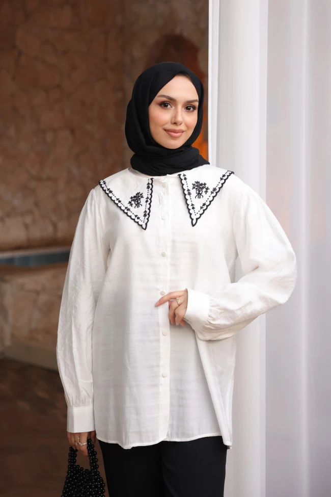 * Ürün Detay : Gömlek, özellikle vintage esintili modern kıyafetleri sevenler için gardırobun yıldızı olmaya aday.Romantik detaylar ile modern kesimi birleştiren, oldukça enerjik bir parça. Bahar ve yaz koleksiyonları için harika bir seçenek.Gömleğin en dikkat çekici özelliği, üzerinde zarif nakış işlemeleri bulunan geniş bebe yakası. Bu detay, tasarıma nostaljik ve romantik bir hava katarken, ürünü sıradan bir gömlekten ayırıp butik bir parça haline getiriyor.Balon kol formundaki geniş kesim ve manşet detayları, tesettür giyimde aranan o dökümlü ve konforlu görünümü destekliyor.