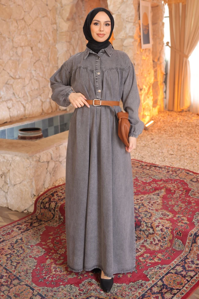 * Ürün Detay : Elbisemiz, denim şıklığını tesettür modasına çok zarif bir şekilde uyarlamış.Üst kısımdaki gömlek yaka tasarımı elbiseye ciddiyet katarken, göğüs hizasındaki hafif büzgülü roba detayı kesimi hareketlendirmiş.Belden aşağıya doğru genişleyen kesim, hem konforlu bir kullanım sunuyor hem de oldukça zarif bir silüet oluşturuyor.Ürünümüz kemerlidir.Satışa kemer dahildir.