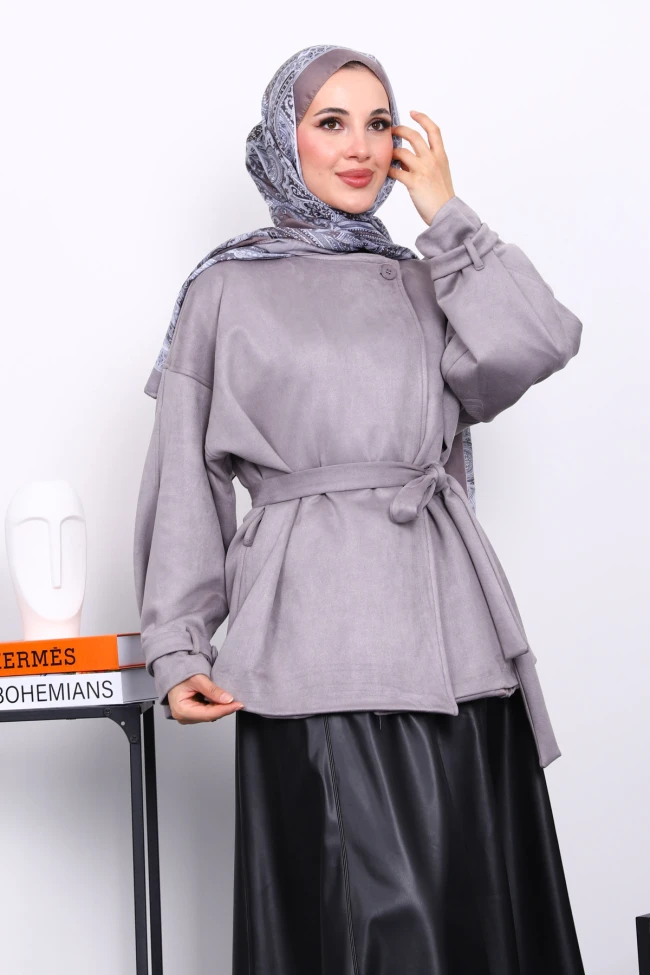 * Ürün Detay : Ürünümüz  Süet kumaştan üretilmiştir.  Bel kısmı kuşaklıdır. Yaka kısmı düğmelidir.