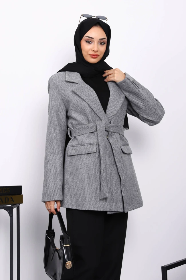 Taş Kuşaklı Astarlı Kısa Kaşe Kaban
