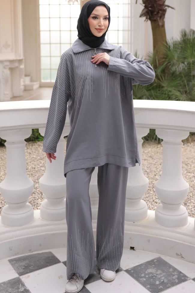 * Ürün Detay : Takım, hem konforu hem de şıklığı bir araya getiren, günlük kullanım için oldukça ideal bir tasarım.Üst kısmın göğüs ve kol detaylarında, pantolonun ise paça kısımlarında yer alan dikey taş işlemeleri, takıma hareket katmış. Bu detaylar boyu daha uzun ve silüeti daha ince gösterme avantajı sağlar.Yarım fermuarlı polo yaka detayı, takıma spor-şık bir hava katıyor. Rahat kesim tunik ve geniş paça pantolon kombinasyonu, gün boyu hareket özgürlüğü sunarken tesettür giyim standartlarına uygun, şık bir duruş sergiliyor.