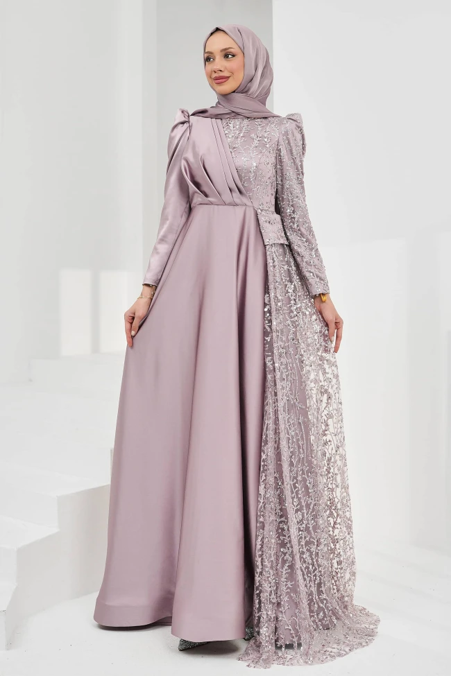 * Ürün Detay : Geleneksel tesettür giyim ile modern tasarım detaylarını birleştiren oldukça gösterişli ve dengeli bir model. Özellikle özel davetler ve düğünler için hem zarif hem de iddialı bir tercih olarak öne çıkıyor.Gümüş ışıltılarla birleştiğinde oldukça premium bir hava katmış.Elbisenin en dikkat çekici kısmı, sol omuzdan aşağıya doğru süzülen ve etek ucuna kadar uzanan dantel tül detay. Bu asimetri, elbiseyi klasik bir düz kesimden kurtarıp modern bir "couture" havası veriyor.Gövdedeki çapraz gelen drapeli saten bölüm, bel hattını belirginleştirirken aynı zamanda vücut hatlarını zarifçe kamufle ediyor.Omuzlardaki hafif büzgü ve dantel işlemeli kollar, modele romantik bir dokunuş katmış.