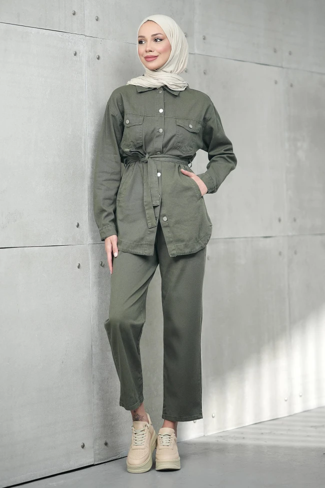 * Ürün Detay : Vücut hatlarını zarifçe dengeleyen kuşak detayı ve nefes alan dokusuyla gün boyu konfor sunan bu takım; modern kesimiyle stilinizi, zamansız rengiyle de kombinlerinizi güçlendiriyor.Ceketin belden kuşaklı olması, oversize kesimi dengelerken vücut hatlarını çok belli etmeden zarif bir silüet oluşturmuş.Göğüs kısmındaki kapaklı cepler ve metalik düğmeler, takıma daha dinamik ve modern bir ceket-gömlek havası veriyor.Pantolonun boyu ve kesimi oldukça ideal.