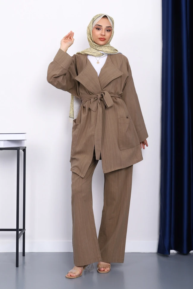 * Ürün Detay : Ürünümüz Keten Kumaştan Üretilmiştir. Kimono ve Pantolon ikili takım şeklindedir. Kimono ön kısmı düğmeli ve kuşaklıdır.