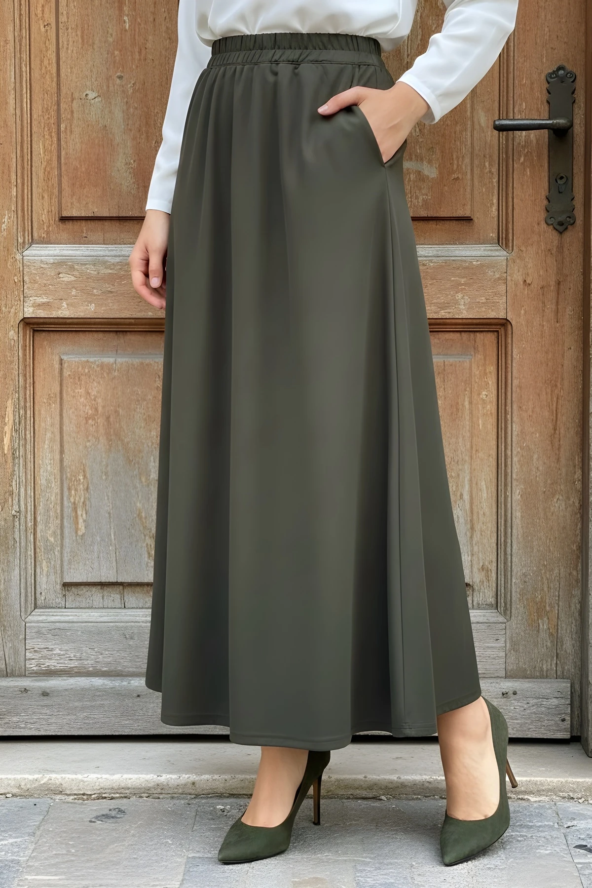 * Ürün Detay : Etek, klasik ve zamansız bir parça olarak öne çıkıyor.Belden aşağıya doğru hafifçe genişleyen bu kesim, vücut hatlarını dengeler ve son derece zarif bir silüet oluşturur.Minimalist kapsül gardırop oluşturmak isteyenler için anahtar parçalardan biridir.Bel lastiklidir ve ceplidir.