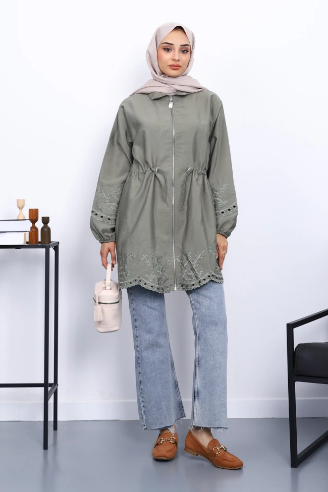 * Ürün Detay : Ürünümüz Modal kumaştan üretilmiştir. Ön kısmı fermuarlı ve bel kısmı kulisan kemer detaylıdır. Kol ve etek uç kısımları  işlemeler yer almaktadır.