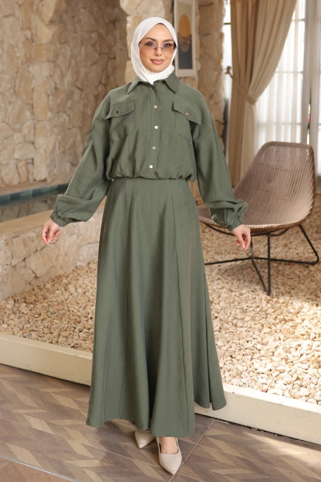 * Ürün Detay : Takım, "çaba sarf etmeden şık" görünmek isteyenler için ideal bir parça.Göğüs cepleri ve metalik düğme detayları takıma dinamik bir hava katmış. Bel kısmındaki büzgü detayı, ceketin formunu korurken vücut hatlarını zarifçe gizliyor. Balon kol kesimi ise tasarıma modern bir dokunuş eklemiş.Yüksek bel kesimi ve çan kesim, boyu daha uzun gösterme avantajına sahip. Eteğin dökümü oldukça muntazam duruyor, bu da kumaş kalitesinin iyi olduğuna işaret eder.Ceket bel ve manşet lastikli.