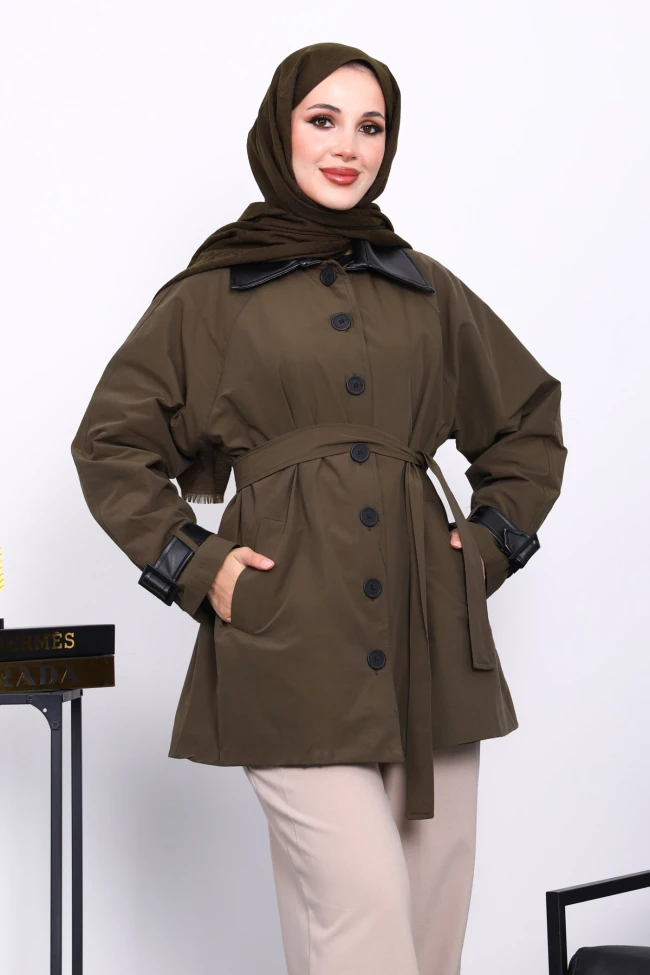 Mürdüm Deri Detaylı Kuşaklı Trençkot Bej Deri Detaylı Kuşaklı Trençkot Kahverengi Deri Detaylı Kuşaklı Trençkot