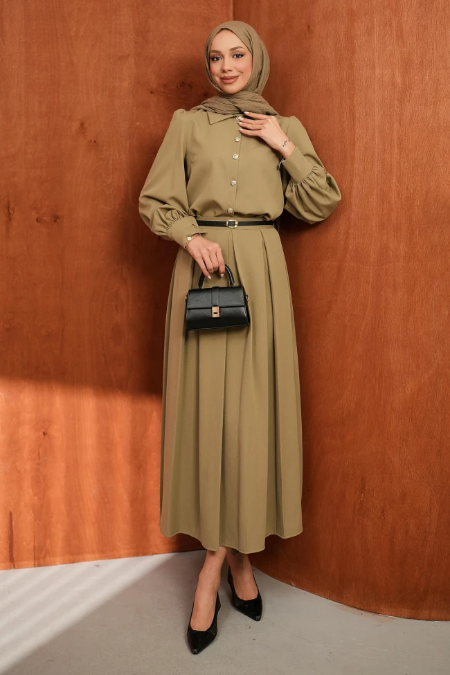 Kahverengi Düğmeli Kemerli Gömlek Etekli Takım Siyah Düğmeli Kemerli Gömlek Etekli Takım Mürdüm Düğmeli Kemerli Gömlek Etekli Takım