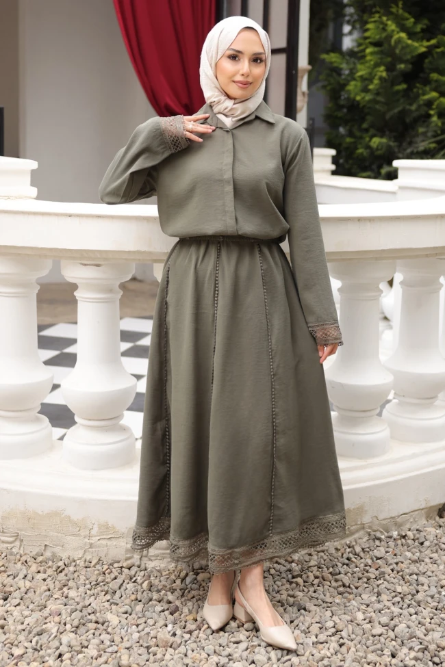 * Ürün Detay : Gömlek etek takımı, romantik dantel detayları ve keten görünümlü dokusuyla oldukça zarif bir duruş sergiliyor. Bohem şıklığı modern muhafazakar çizgilerle birleştiren, hem günlük hem de özel davetler için uygun olan çok yönlü bir tasarım.Manşetlerdeki geniş dantel detayları, sade gömleğe romantik bir hareket katıyor.A-kesim, geniş ve dökümlü etek yapısı, dikey şerit halindeki fisto detaylarıyla zenginleştirilmiş. Etek ucundaki geniş dantel bordür, takımın manşetleriyle mükemmel bir bütünlük sağlıyor.Etek bel lastiklidir.