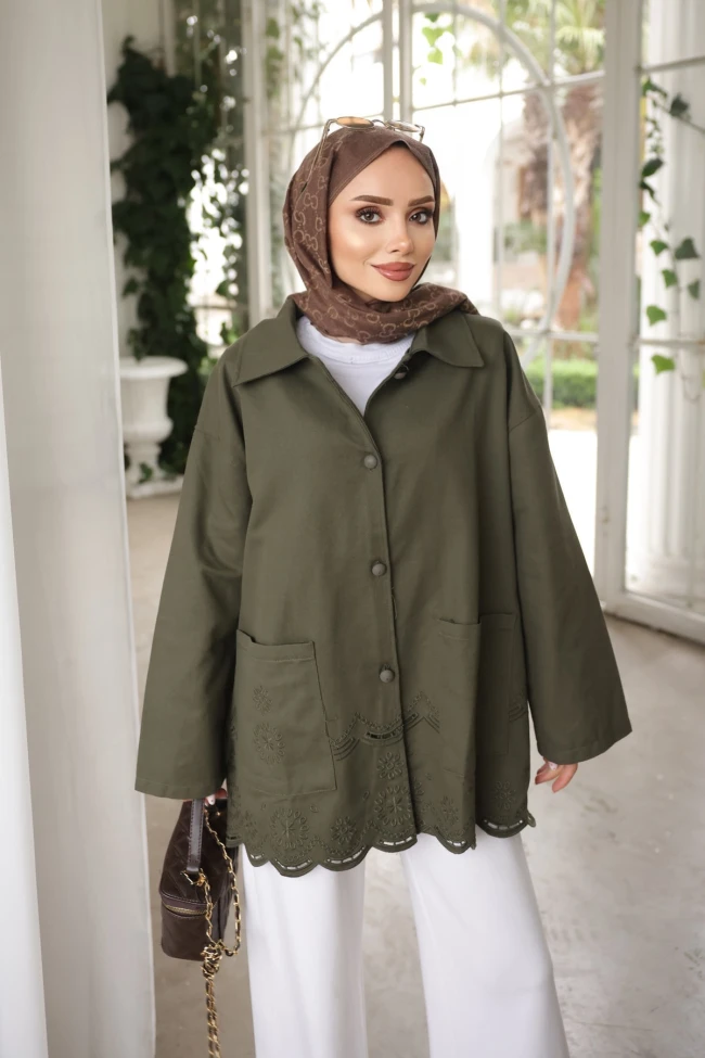 * Ürün Detay :Zarif detayları ve güçlü duruşuyla bu ceket, stilinize sofistike bir dokunuş katıyor.Nakış işlemeler, maskülen ceket formuna feminen bir zarafet aşılıyor.Ceket, geleneksel işleme sanatını modern ve salaş bir kesimle birleştirerek bahar aylarının vazgeçilmezi olmaya aday.Geniş ve fonksiyonel yan cepler.Kumaşla aynı tonda, şık büyük düğmeli ön kapama.Modern bir hava katan düşük omuz ve geniş kol yapısı.Geniş ve rahat oversize kesim.
