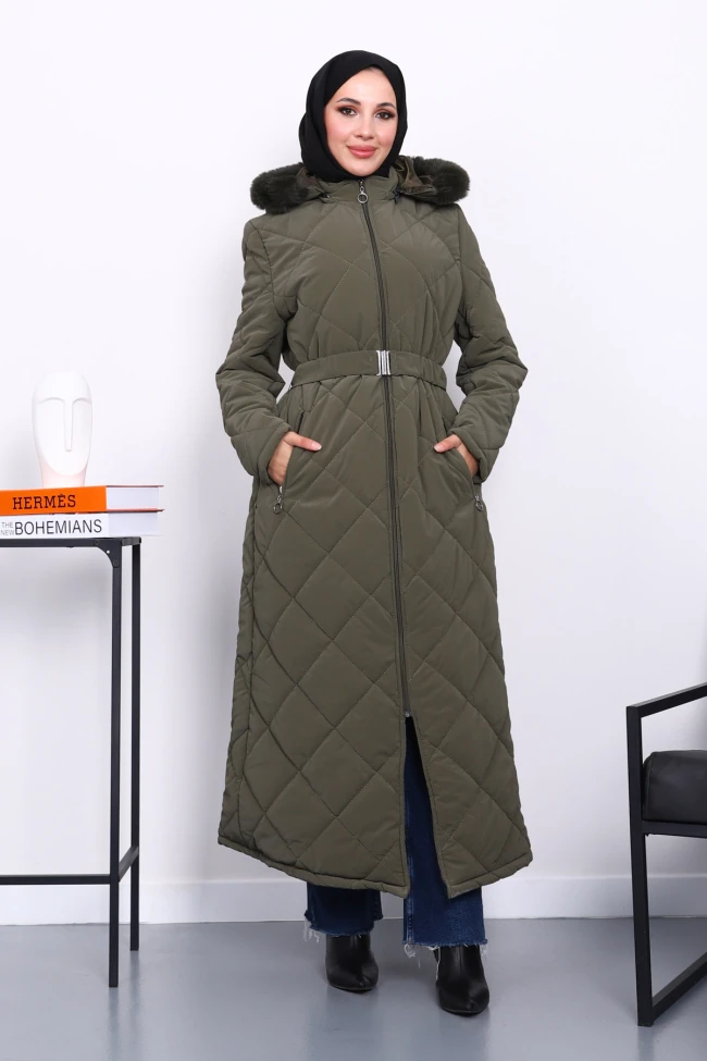 Siyah Kapüşonlu Kapitone Uzun Şişme Mont Vizon Kapüşonlu Kapitone Uzun Şişme Mont