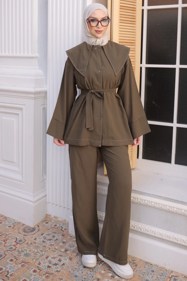 * Ürün Detay : Modern muhafazakar giyimin en şık örneklerinden biri olan bu ikili takım, hem ofis şıklığında hem de günlük kombinlerinizde favori parçanız olmaya aday.Kontrast dikiş detaylarıyla fark oluşturan bu tasarım, konforu elden bırakmadan stil sahibi görünmenizi sağlar.Retro esintili oversize geniş yaka detayı ve ön kısımdaki belirgin beyaz kontrast dikişler takıma hareketli bir hava katar.Kendi kumaşından ince kuşak detayı sayesinde bel formunu istediğiniz gibi ayarlayabilir, daha feminen bir silüet oluşturabilirsiniz.Rahat kesim tunik üst ve bol paça pantolon ile gün boyu hareket özgürlüğü sunar.Pantolon ceplidir.