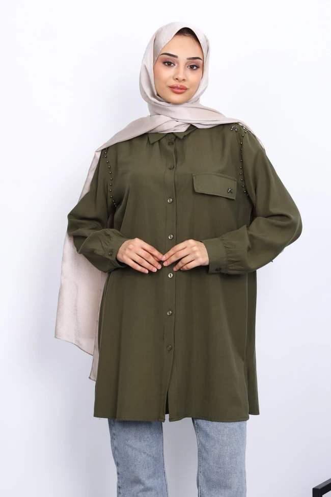 * Ürün Detay : Ürünümüz Pamuklu Modal Tensel Kumaştan Üretilmiştir. Ön kısmı düğme detaylı olup, omuz kısımları boncuk işlemelidir.