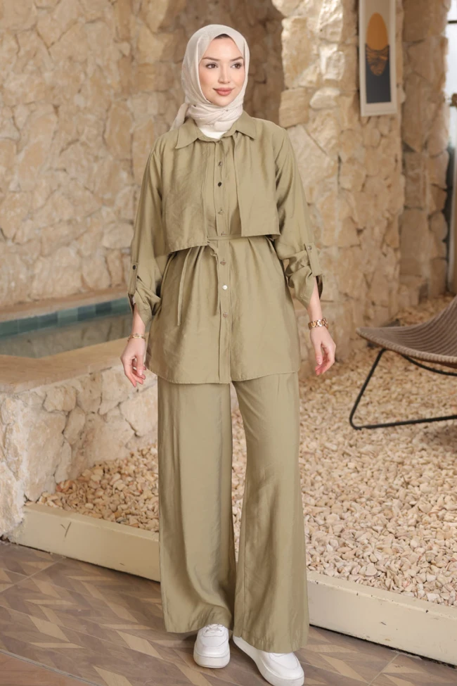 * Ürün Detay : Takım, hem modern hem de oldukça şık bir tasarıma sahip.Beldeki bağlama detayı vücut hatlarını zarifçe belirginleştirirken, göğüs kısmındaki katmanlı (pelerin havası veren) detay tasarıma hareket katmış.Düğmeli olması kullanım kolaylığı sağlıyor.Bol paça kesim, hem gün boyu konfor sunar hem de boyu olduğundan daha uzun gösterir. Kumaşın dökümlü yapısı takımın kalitesini ön plana çıkarıyor.Pantolon bel lastikli ve cepli.