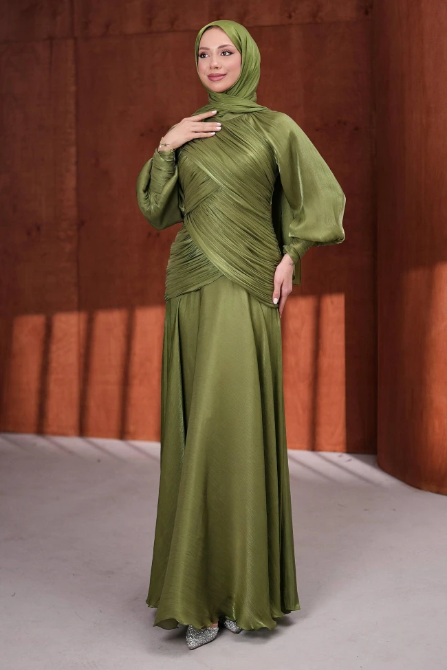 * Ürün Detay : Abiye, hem asil hem de oldukça modern bir duruşa sahip.Elbisenin en dikkat çekici kısmı, gövdedeki çapraz gelen yoğun drapeler. Bu detay, bel bölgesini vurgulayarak daha ince bir silüet oluştururken tasarıma derinlik katmış.Bilek kısmında daralan geniş kollar, elbiseye romantik ve biraz da "vintage" bir hava katıyor. Kolların hafif transparan yapısı, elbiseye hareket kazandırmış.Abiye, "çabasız şıklık" dediğimiz kavramı çok iyi yansıtıyor. Hem modest standartlarına uygun hem de oldukça iddialı bir tasarım. Kolları fermuarlıdır.