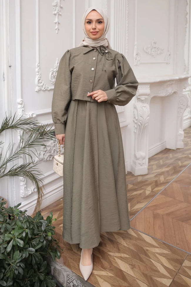 * Ürün Detay : İkili takım, hem klasik hem de modern detayları bir araya getiren oldukça şık bir tesettür kombin örneği.Crop ceket formu, beli daha yüksek göstererek boyu uzun gösterme avantajı sağlıyor. Gömlek yaka ve gold rengi taşlı düğmeler, tasarıma feminen ve zarif bir hava katmış. Omuzlardaki hafif büzgü, modern bir silüet oluşturuyor.Yüksek belli, geniş kesim etek, üst parçanın kısalığını mükemmel dengeliyor. Kumaşın dökümlü duruşu hem konforlu hem de asil bir görünüm sunmuş.