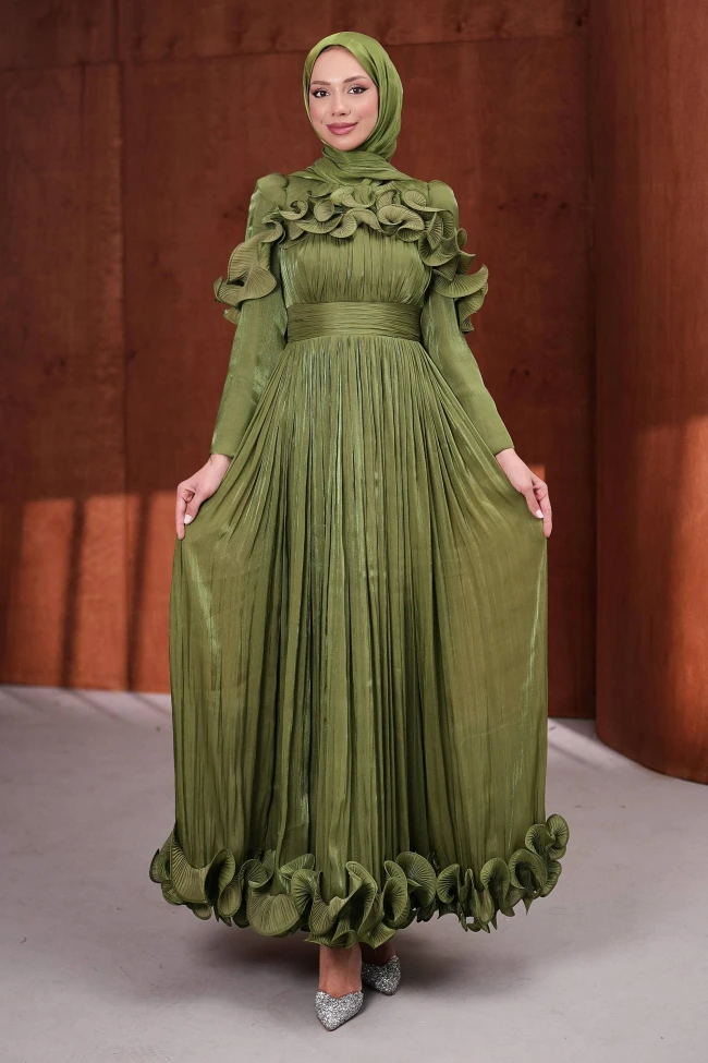 * Ürün Detay : Abiye, hem asil hem de oldukça hareketli bir tasarıma sahip.Elbisenin boydan boya piliseli olması, silüeti daha uzun ve ince gösteren harika bir işçilik. Ayrıca eteğin akışkanlığını artırarak yürürken çok şık bir hareket sağlar.Omuzlardaki ve etek ucundaki dairesel fırfır detayları elbiseye romantik ve maksimalist bir hava katmış. Özellikle omuzlardaki katmanlar, dar omuzlu kişileri daha dengeli gösterir.
