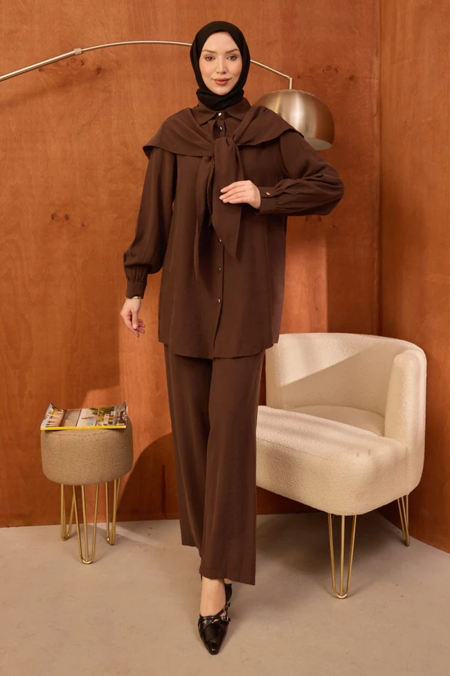 * Ürün Detay : Takım, hem modern kesimi hem de zarif detaylarıyla koleksiyonun en dikkat çekici parçalarından biri olmaya aday.Gömlek yaka üzerine eklenen geniş volan detayı ve ön kısımdaki bağlama detayı, takıma hareketli ve feminen bir hava katmış.Rahat kesim, bol paça pantolon tasarımı hem konfor sunuyor hem de asil bir duruş sergiliyor.