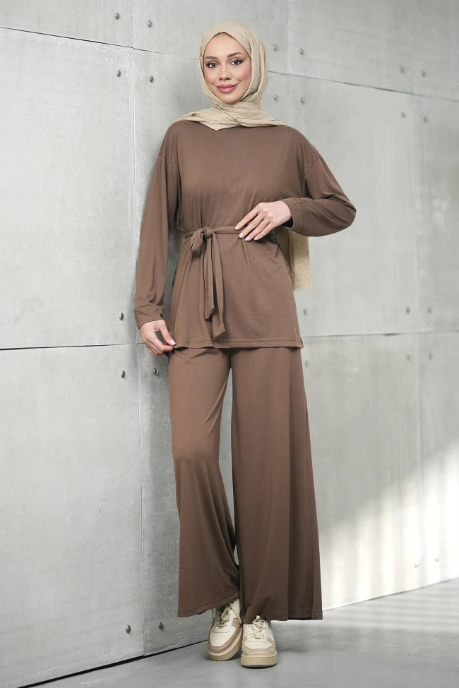 * Ürün Detay : İkili takım, hem konforu hem de zarafeti bir araya getiren modest tarz giyim örneği.Düşük omuzlu ve geniş kesimli olması, gün boyu hareket özgürlüğü sağlar. Beldeki kuşak detayı, silueti belirginleştirerek formun kaybolmasını engellemiş ve takıma daha derli toplu bir görünüm kazandırmış.Bol paça kesimi hem çok moda hem de rahatlık açısından avantajlı.Pantolon bel bağlamalı ve cepli yüksek bel.Tunik bel kısmı köprülü.