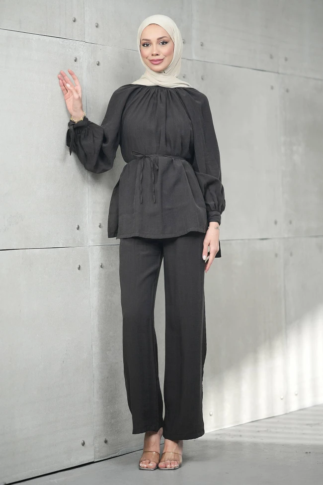 * Ürün Detay : Yeni sezon ikili takım, hem modern hem de oldukça zarif bir çizgiye sahip. Şıklığı konforla birleştirmek isteyenler için harika bir seçenek.Hakim yaka ve büzgü detayları, yüze daha toplu ve zarif bir ifade katıyor.Balon kol formundaki büzgüler ve bilekteki bağlama detayları takıma hareketli ve romantik bir hava katmış.Kendi kumaşından olan ince kuşak, silüeti belirginleştirerek salaş görünümün içinde vücut hatlarını dengeliyor.Bol paça kesimi, hem tesettür giyim standartlarına uygun bir konfor sunuyor hem de boyu daha uzun gösteren bir illüzyon yaratıyor.Tunik yan yırtmaçlıdır.